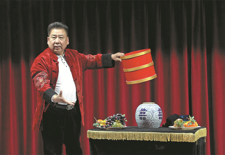 Tian Xueming, a folk artist, does magic tricks at a temple fair in Beijing's Deshengmen area. [ZOU HONG/CHINA DAILY]