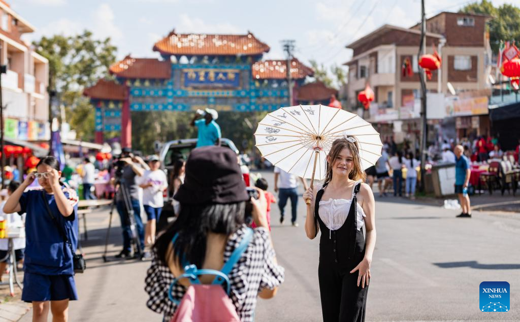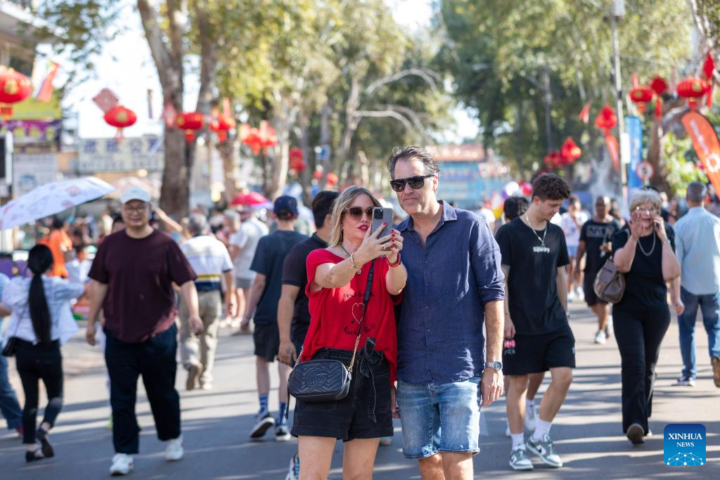 Visitors take selfies at Chinatown in Johannesburg, South Africa, Feb. 17, 2024. A Chinese Lunar New Year Celebration was held here on Saturday. (Xinhua/Zhang Yudong)