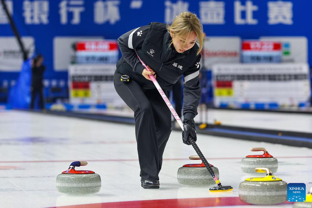 Zhu Zeyangxu of Fujian competes during the mixed doubles 9th round match between Ba Dexin/Jiang Yilun of Heilongjiang and Wang Zhiyu/Zhu Zeyangxu of Fujian at curling event in Hulun Buir, north China's Inner Mongolia Autonomous Region, Feb. 19, 2024. (Xinhua/Jiang Fan)