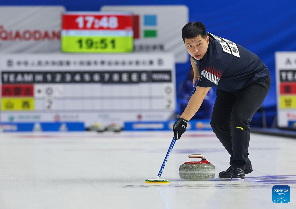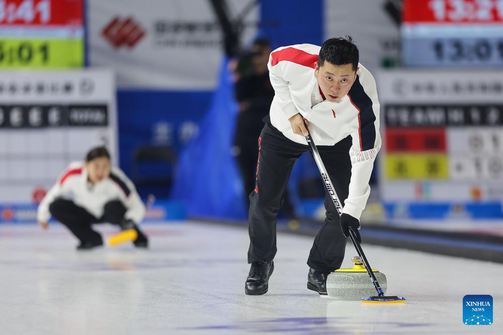 Ba Dexin of Heilongjiang competes during the mixed doubles 9th round match between Ba Dexin/Jiang Yilun of Heilongjiang and Wang Zhiyu/Zhu Zeyangxu of Fujian at curling event in Hulun Buir, north China's Inner Mongolia Autonomous Region, Feb. 19, 2024. (Xinhua/Jiang Fan)