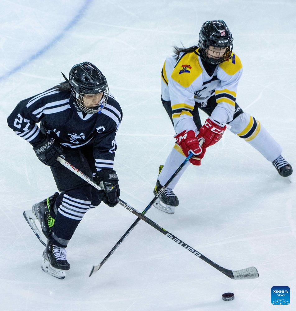 Yang Liao (L) of Inner Mongolia competes during the girl's round robin group B match between Inner Mongolia and Liaoning of ice hockey event in Hulun Buir, north China's Inner Mongolia Autonomous Region, Feb. 19, 2024. (Xinhua/Chen Xinbo)