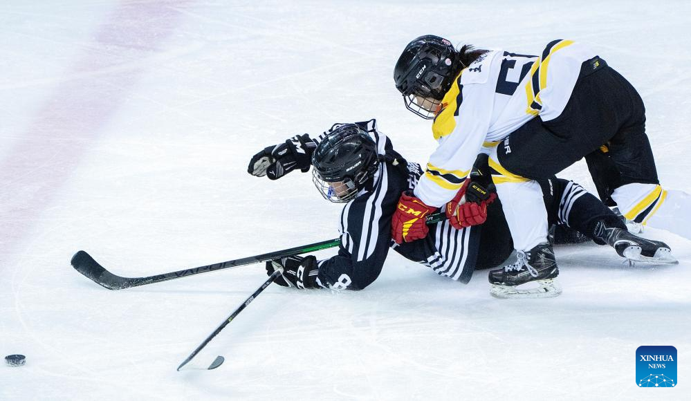 Liu An'na (L) of Inner Mongolia falls on the ice rink during the girl's round robin group B match between Inner Mongolia and Liaoning of ice hockey event in Hulun Buir, north China's Inner Mongolia Autonomous Region, Feb. 19, 2024. (Xinhua/Chen Xinbo)