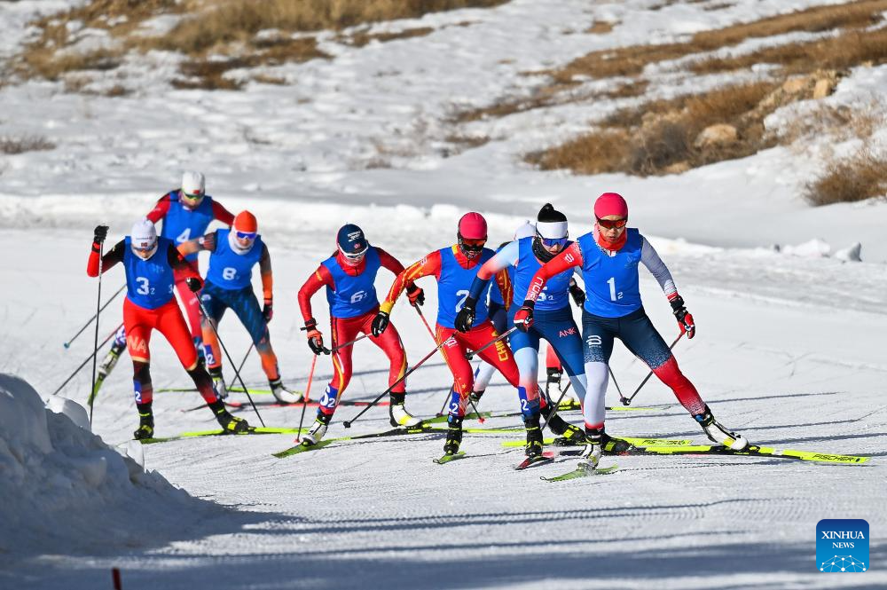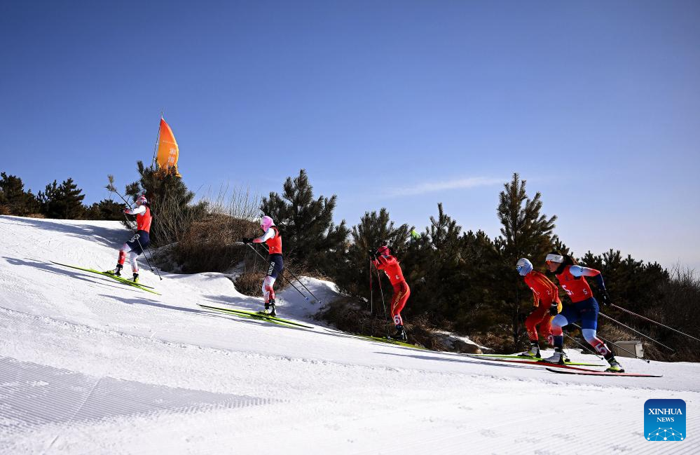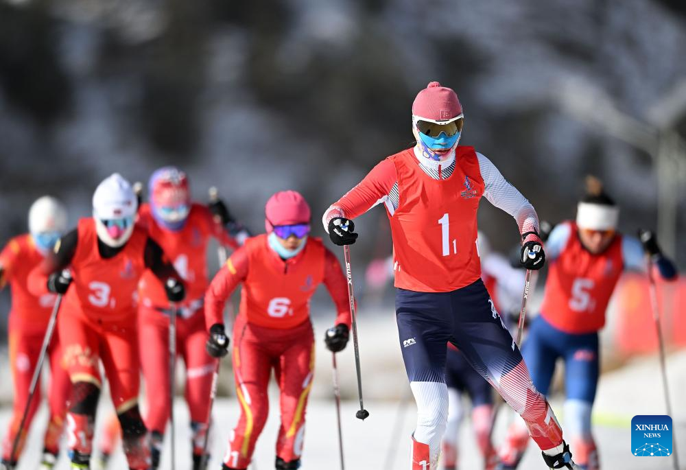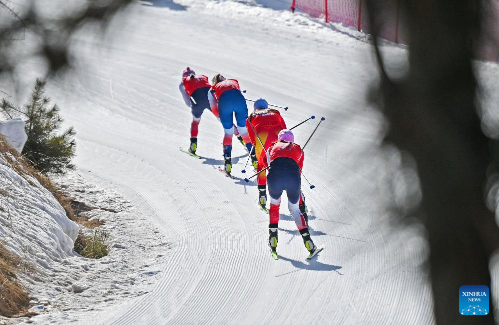 Li Xin (front R) of team Heilongjiang competes during the women's team relay final of cross country event in Ulanqab, north China's Inner Mongolia Autonomous Region, Feb. 19, 2024. (Xinhua/Liu Lei)