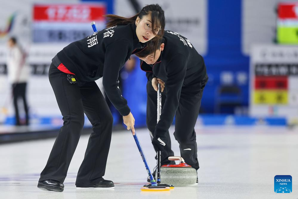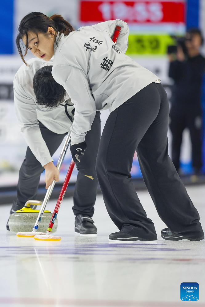 Han Peng/Han Siyu of Jilin compete during the mixed doubles 9th round match against Ling Zhi/Han Yu of Beijing at curling event in Hulun Buir, north China's Inner Mongolia Autonomous Region, Feb. 19, 2024. (Xinhua/Jiang Fan)