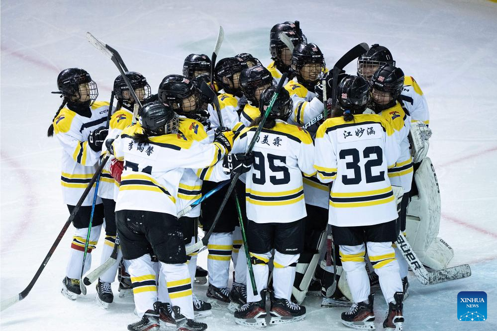 Players of Liaoning celebrate after winning the girl's round robin group B match between Inner Mongolia and Liaoning of ice hockey event in Hulun Buir, north China's Inner Mongolia Autonomous Region, Feb. 19, 2024. (Xinhua/Chen Xinbo)