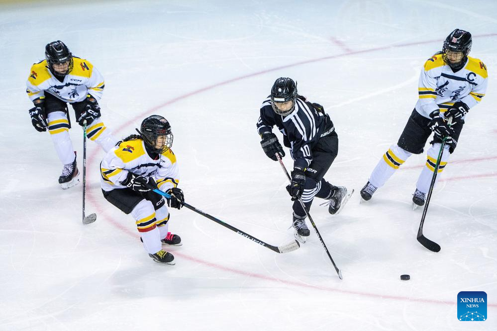 Zhao Xinrui (2nd R) of Inner Mongolia competes during the girl's round robin group B match between Inner Mongolia and Liaoning of ice hockey event in Hulun Buir, north China's Inner Mongolia Autonomous Region, Feb. 19, 2024. (Xinhua/Chen Xinbo)