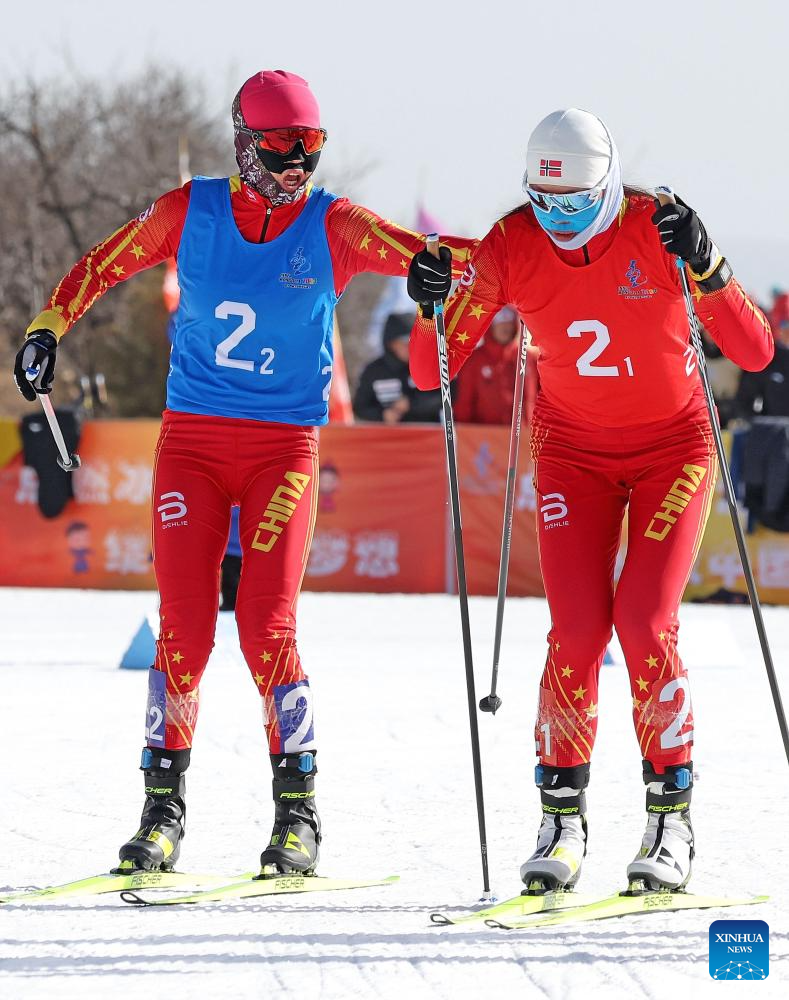 Chi Chunxue (front R) of team Heilongjiang competes during the women's team relay final of cross country event in Ulanqab, north China's Inner Mongolia Autonomous Region, Feb. 19, 2024. (Xinhua/Zhao Zishuo)