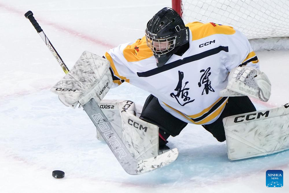 Cao Ruohan of Liaoning defends during the girl's round robin group B match between Inner Mongolia and Liaoning of ice hockey event in Hulun Buir, north China's Inner Mongolia Autonomous Region, Feb. 19, 2024. (Xinhua/Chen Xinbo)