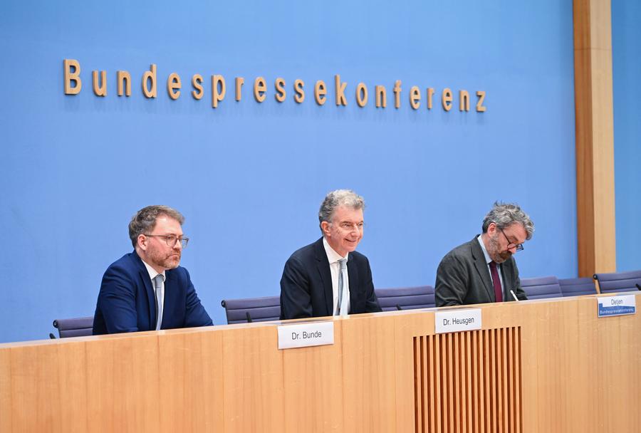 Munich Security Conference (MSC) Chairman Christoph Heusgen (C) attends the release of the 2024 Munich Security Report in Berlin, Germany, Feb. 12, 2024. (Xinhua/Ren Pengfei)