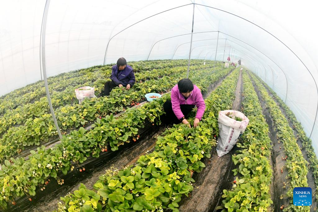 Farmers arrange strawberry plants in Fantai Village, Shijiazhuang of north China's Hebei Province, Feb. 19, 2024. Farmers across China are busy with agricultural production as the day of Yushui (Rain Water), the second of the 24 solar terms in the Chinese lunar calendar, came on Monday this year. (Photo by Li Mingfa/Xinhua)