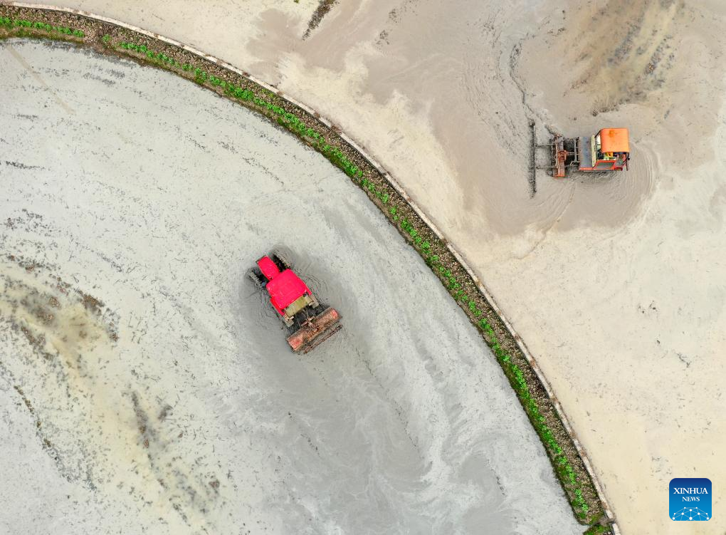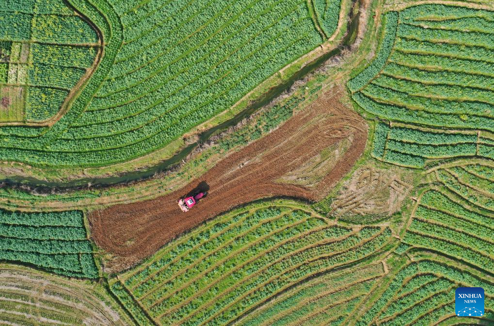 An aerial drone photo taken on Feb. 19, 2024 shows farmers operating machines to plough fields in Shichuan Village, Guan'ge Township, Guang'an City of southwest China's Sichuan Province. Farmers across China are busy with agricultural production as the day of Yushui (Rain Water), the second of the 24 solar terms in the Chinese lunar calendar, came on Monday this year. (Photo by Zhang Qifu/Xinhua)