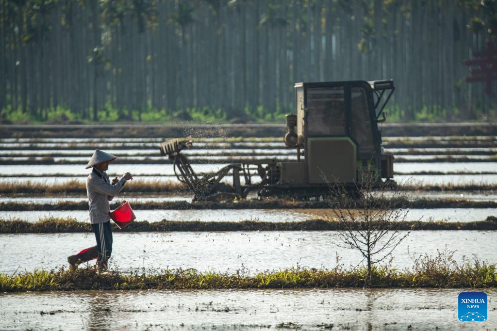 A farmer operates a machine to plough fields in Shimen Village, Siba Township, Luocheng Mulao Autonomous County, south China's Guangxi Zhuang Autonomous Region, Feb. 19, 2024. Farmers across China are busy with agricultural production as the day of Yushui (Rain Water), the second of the 24 solar terms in the Chinese lunar calendar, came on Monday this year. (Photo by Wei Rudai/Xinhua)
