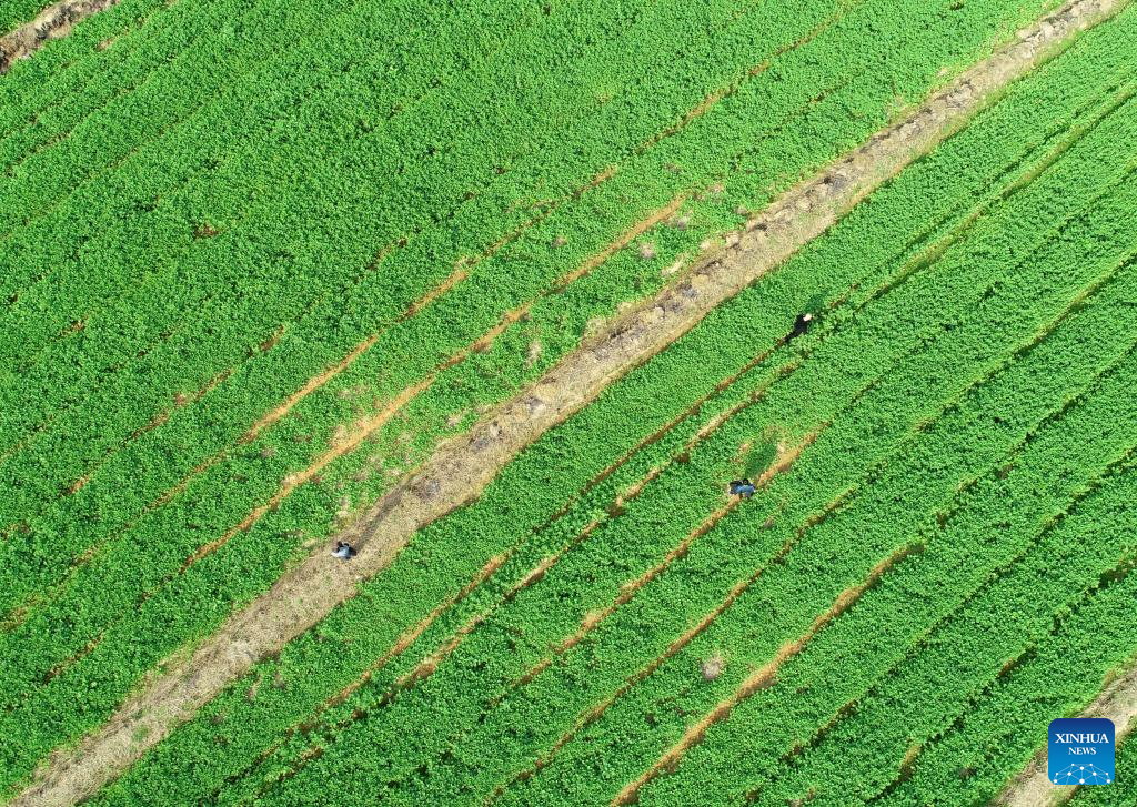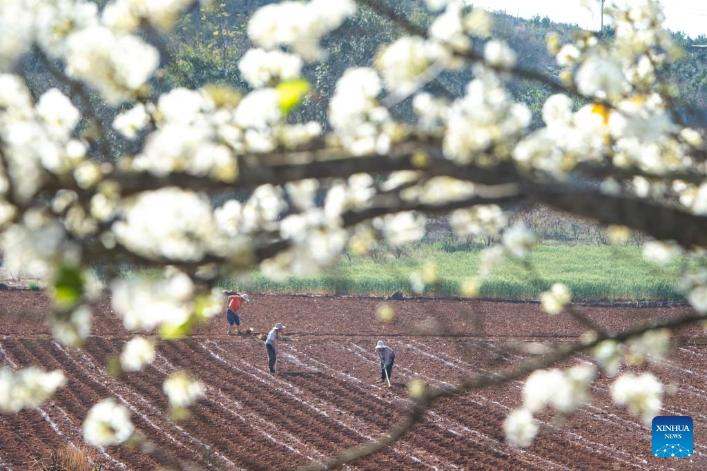 Farmers work in fields in Huazhuang Village, Matang Township, Wenshan Zhuang and Miao Autonomous Prefecture, southwest China's Yunnan Province, Feb. 19, 2024. Farmers across China are busy with agricultural production as the day of Yushui (Rain Water), the second of the 24 solar terms in the Chinese lunar calendar, came on Monday this year. (Photo by Xiong Pingxiang/Xinhua)