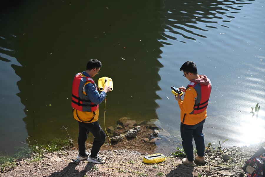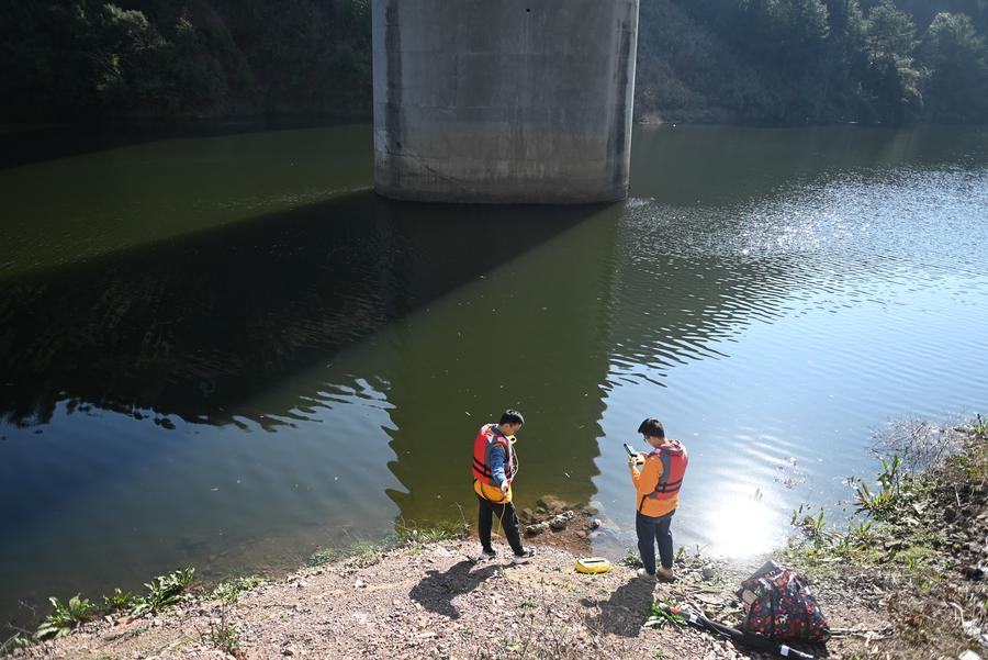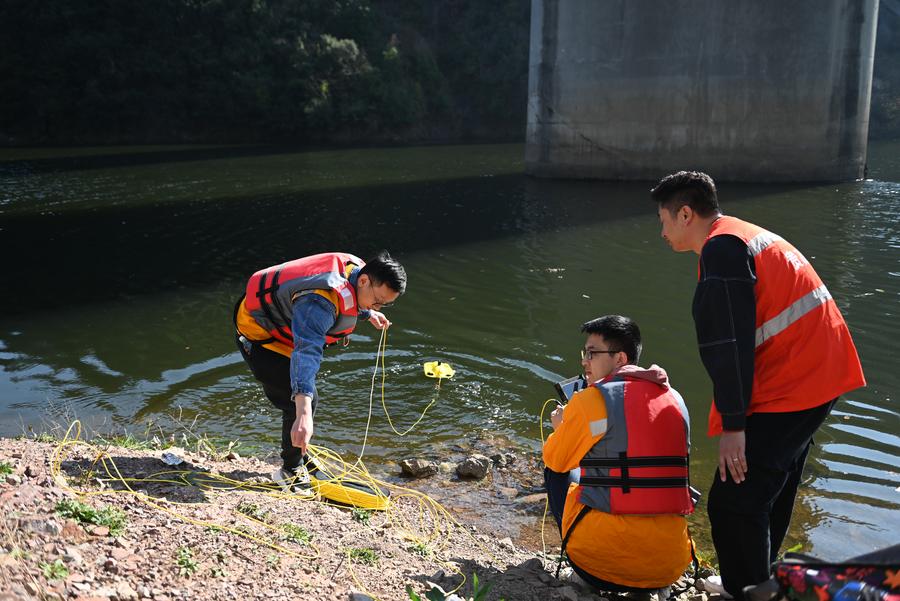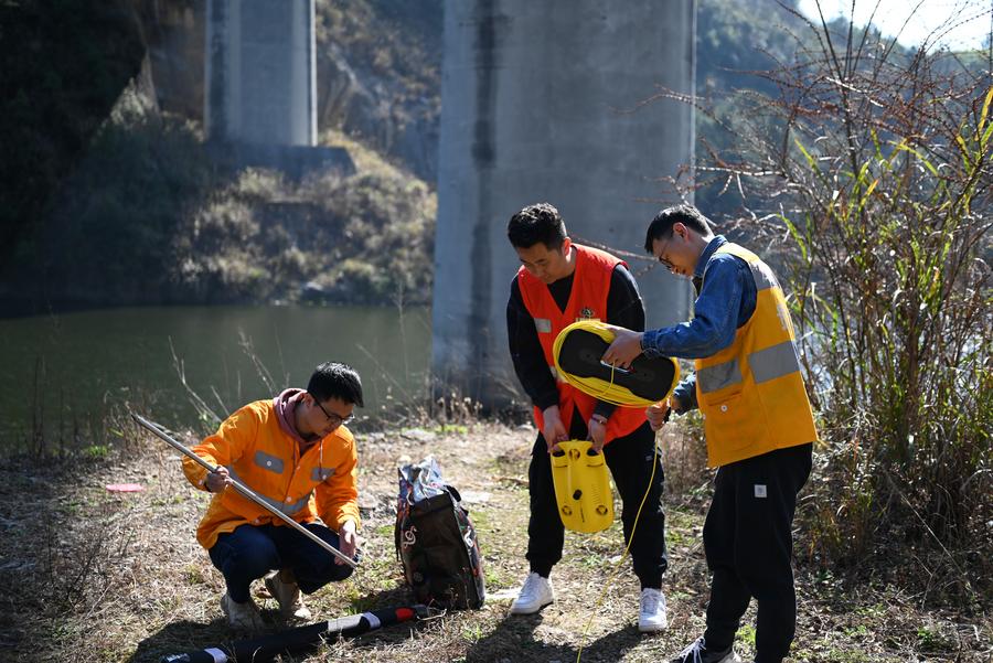 Technicians operate an unmanned submersible for checking piers of a bridge of Chengdu-Guiyang High-Speed Railway in Guiyang, southwest China's Guizhou Province, Feb. 19, 2024. (Xinhua/Liu Xu)