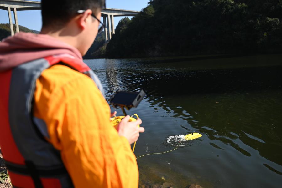 A technician operates an unmanned submersible for checking piers of a bridge of Chengdu-Guiyang High-Speed Railway in Guiyang, southwest China's Guizhou Province, Feb. 19, 2024. (Xinhua/Liu Xu)