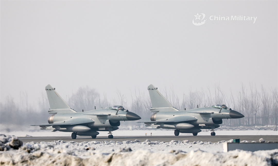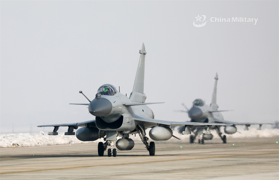 Fighter jets attached to an aviation brigade with the air force under the PLA Northern Theater Command taxi on the runway in formation during a flight training exercise after snow on January 29, 2024. (eng.chinamil.com.cn/Photo by Zhang Ziang)