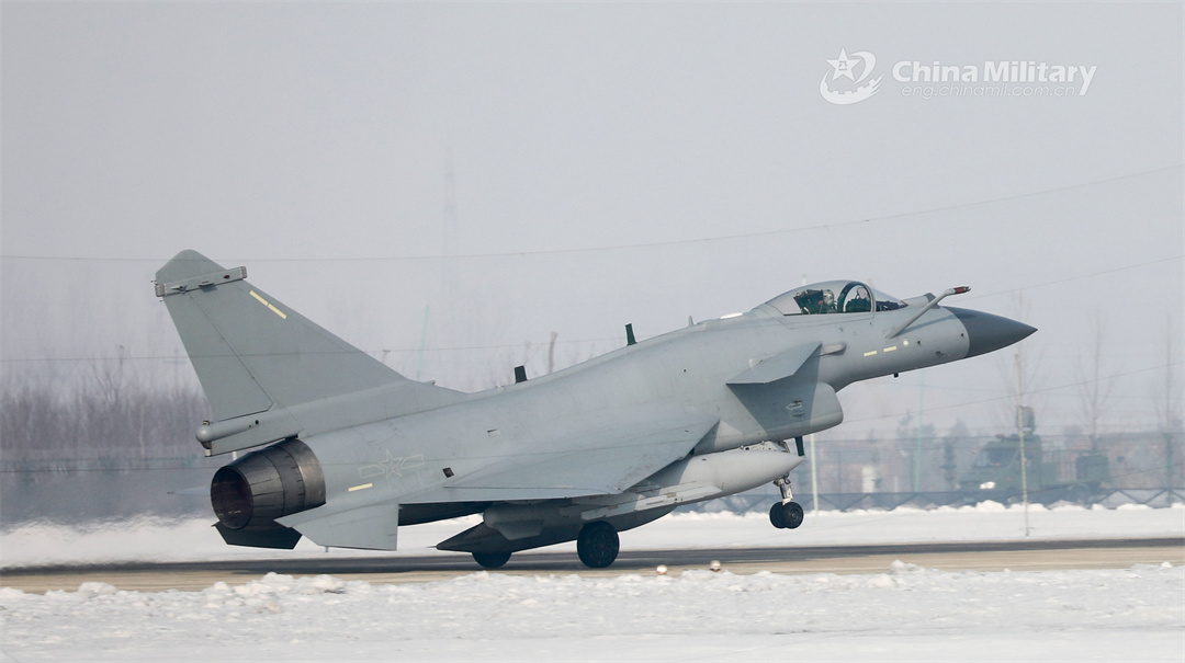 A fighter jet attached to an aviation brigade with the air force under the PLA Northern Theater Command taxis on the runway during a flight training exercise after snow on January 29, 2024. (eng.chinamil.com.cn/Photo by Zhang Ziang)
