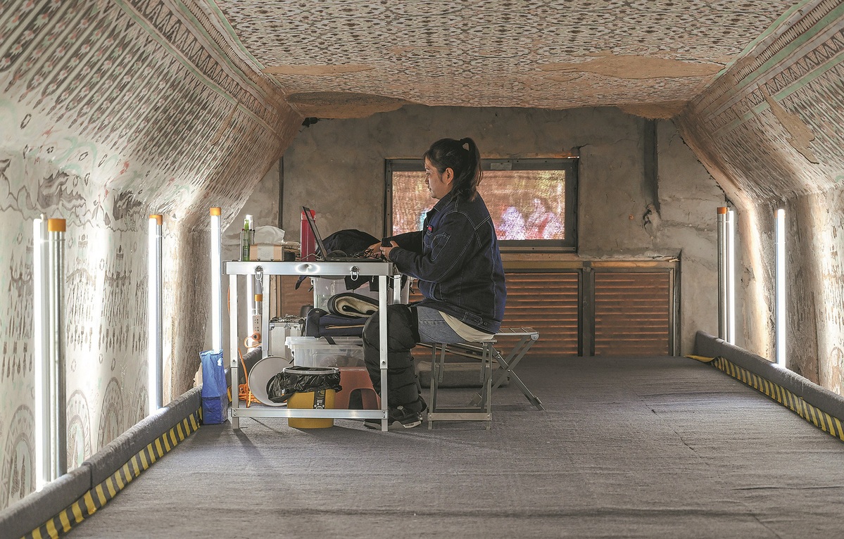 An archaeologist organizes data collected for the protection of the murals in a cave of the Mogao Caves in Dunhuang. [LI HE/XINHUA]