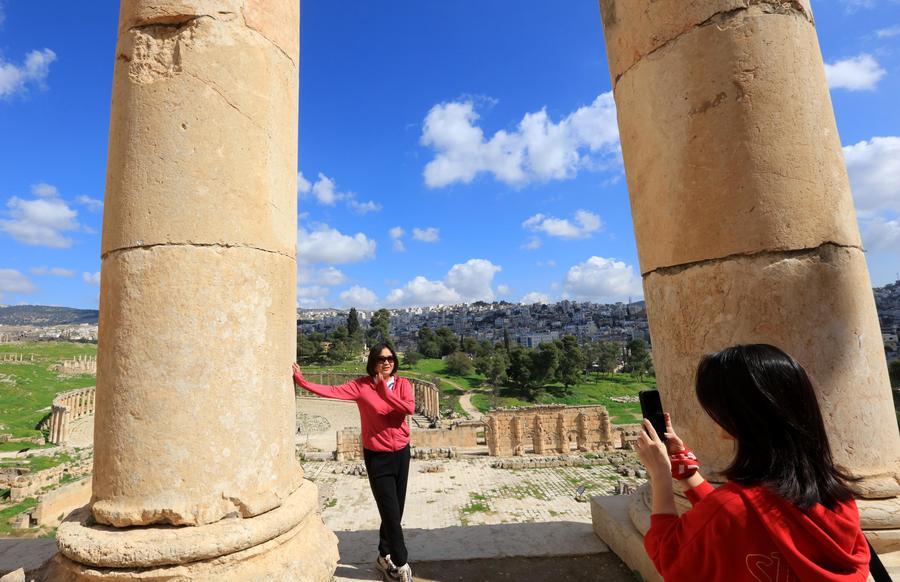 A Chinese tourist poses for photos while visiting the archaeological site of Jerash in Jordan, Feb. 10, 2024. (Photo by Mohammad Abu Ghosh/Xinhua)