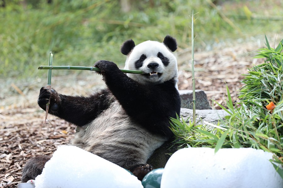 Giant panda "Bao Mei" has birthday meal at the Pairi Daiza zoo in Brugelette, Belgium, Aug. 6, 2022. (Xinhua/Zheng Huansong)