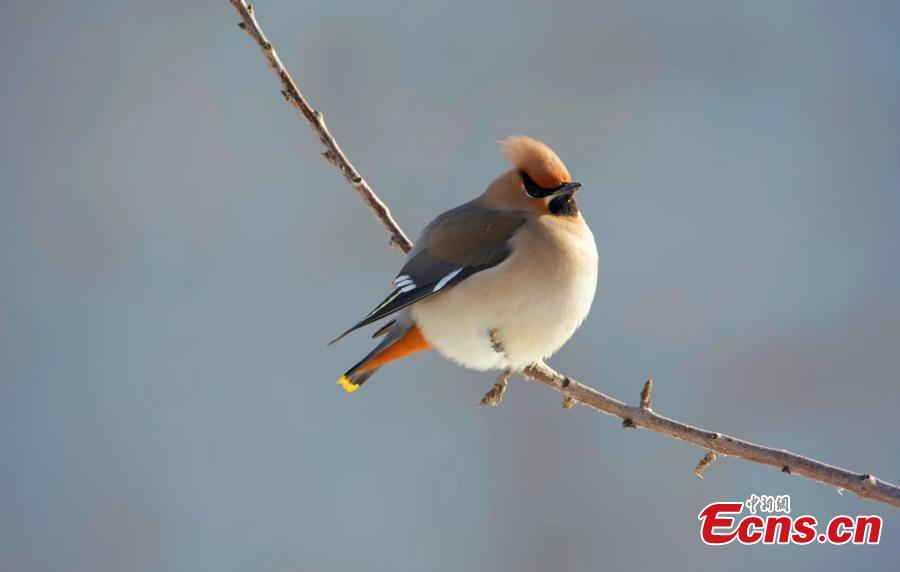 A bohemian waxwing rests on a branch of a tree in Tekes County, northwest China's Xinjiang Uygur Autonomous Region. (Photo/China News Service/Zhong Dong)