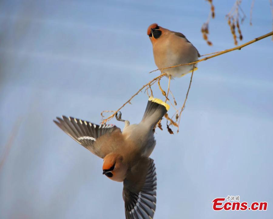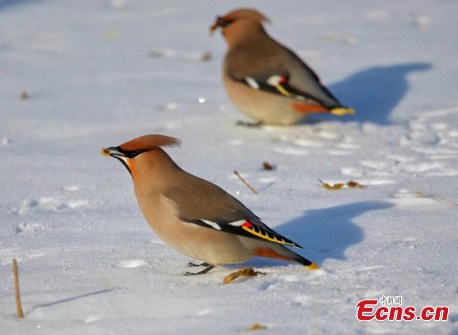 Bohemian waxwings forage for food on the snow in Tekes County, northwest China's Xinjiang Uygur Autonomous Region. (Photo/China News Service/Zhong Dong)