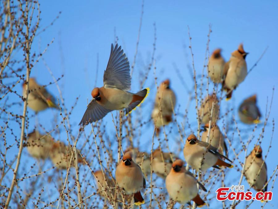 A flock of bohemian waxwings rest on branches of a tree in Tekes County, northwest China's Xinjiang Uygur Autonomous Region. (Photo/China News Service/Zhong Dong)