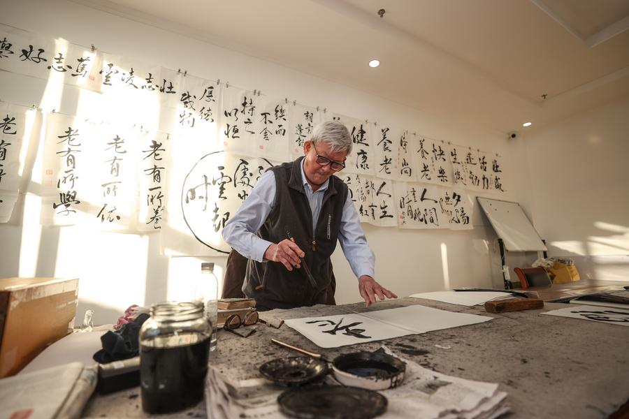A senior resident practices calligraphy at an old-age service center in Yingkou, northeast China's Liaoning Province, Jan. 15, 2024. (Xinhua/Long Lei)