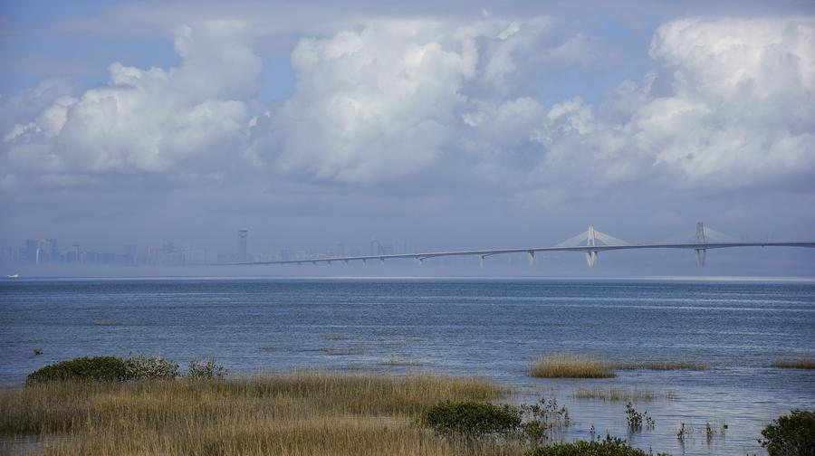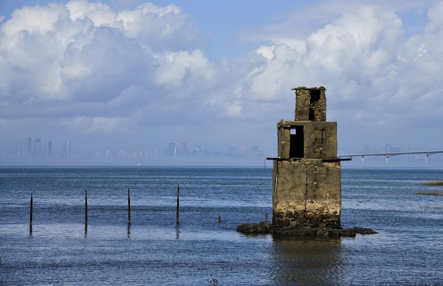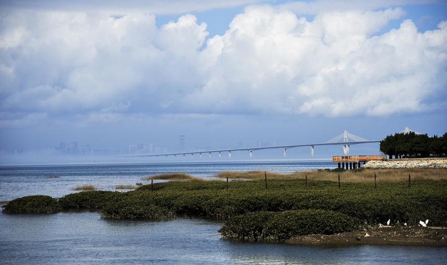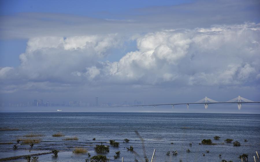 This photo taken on Feb. 21, 2024 shows the Kinmen bridge and a view of Xiamen in the distance seen from an estuary in Kinmen. (Xinhua/Chen Jianxing)