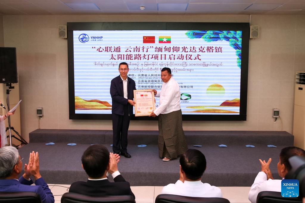 At the ceremony, 40 sets of solar-powered streetlights, donated by China's Yunnan Provincial People's Association for Friendship with Foreign Countries, were handed over to a ward administrator of Thaketa Township, Yangon.