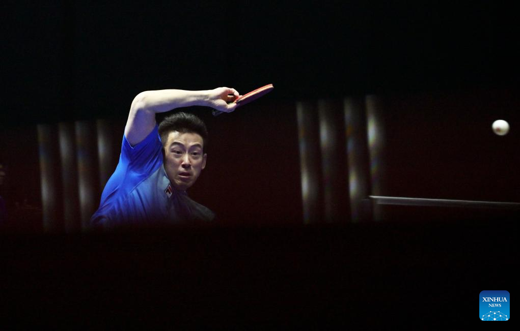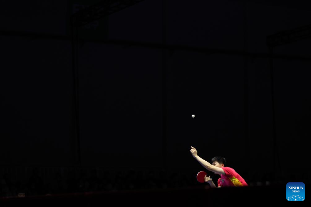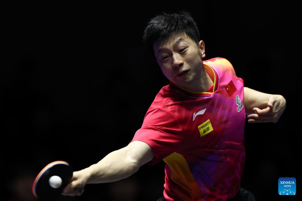 Ma Long of China competes against Darius Movileanu of Romania during the men's team round of 16 match at the ITTF World Team Table Tennis Championships Finals Busan 2024 in Busan, South Korea, Feb. 21, 2024. (Xinhua/Zhang Tao)