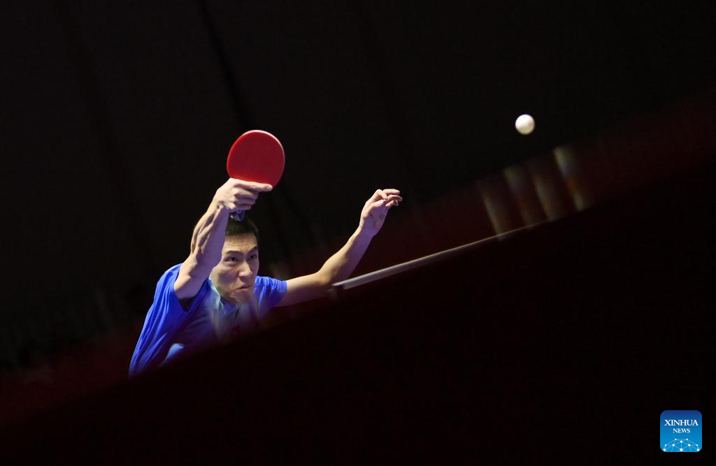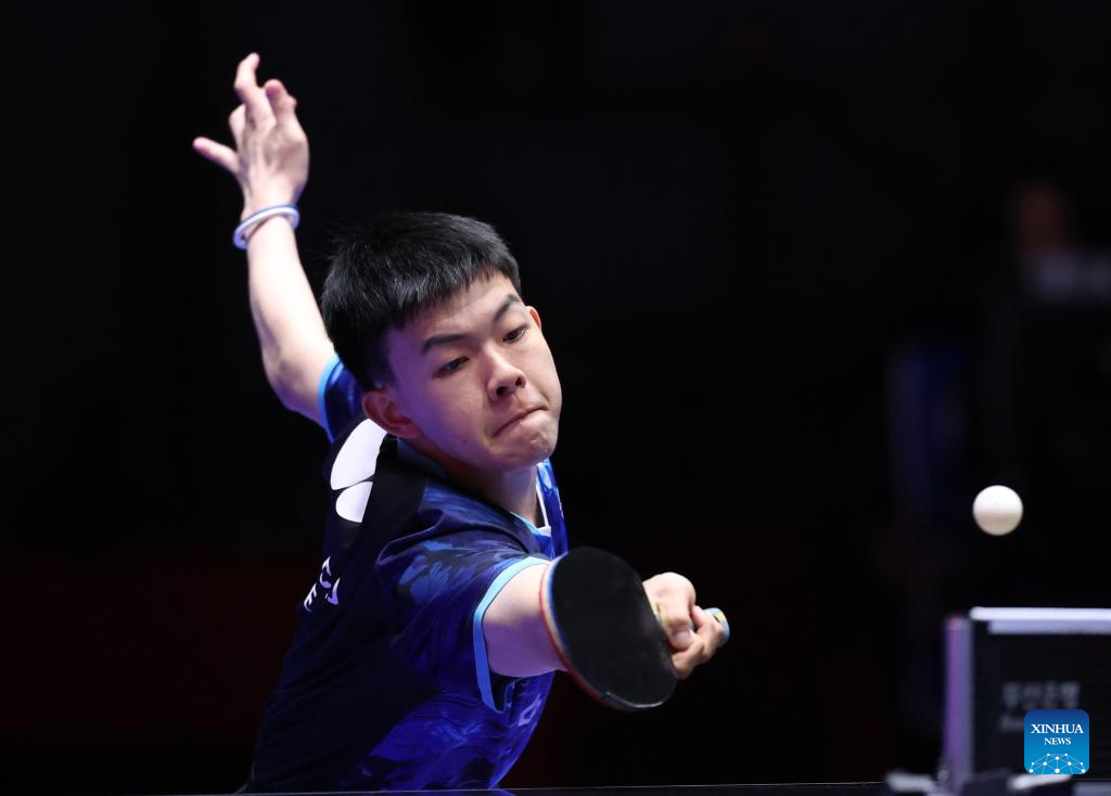 Kao Cheng-Jui of Chinese Taipei competes against Marko Jevtovic of Serbia during the men's team round of 32 match between Chinese Taipei and Serbia at the ITTF World Team Table Tennis Championships Finals Busan 2024 in Busan, South Korea, Feb. 21, 2024. (Xinhua/Yang Shiyao)