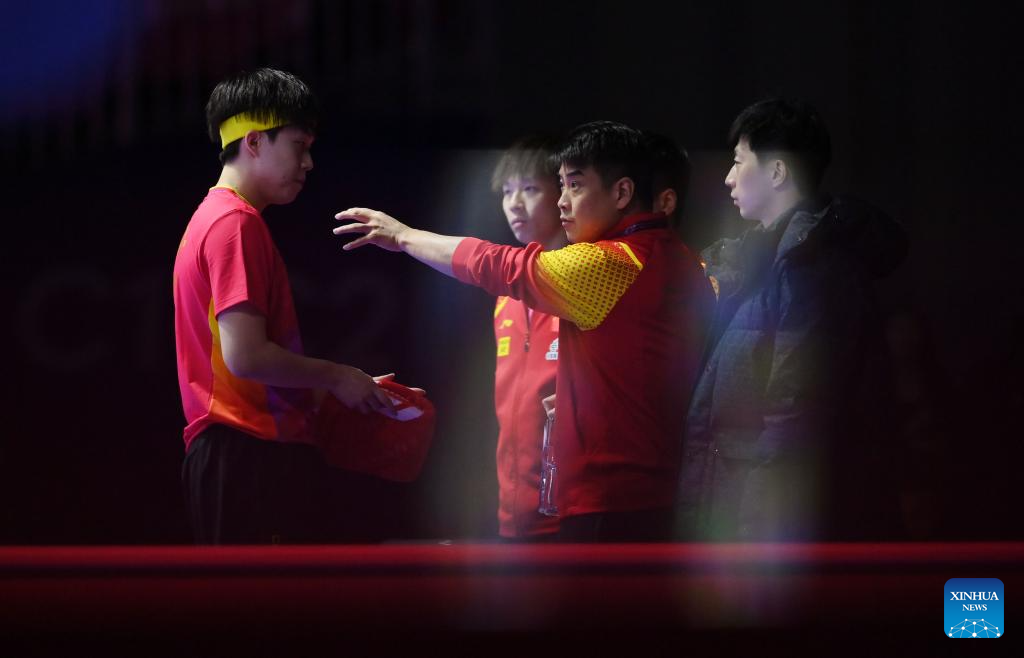 Coach Wang Hao (3rd L) of China gives instructions to player Wang Chuqin (1st L) during the men's team round of 16 match at the ITTF World Team Table Tennis Championships Finals Busan 2024 in Busan, South Korea, Feb. 21, 2024. (Xinhua/Tao Xiyi)
