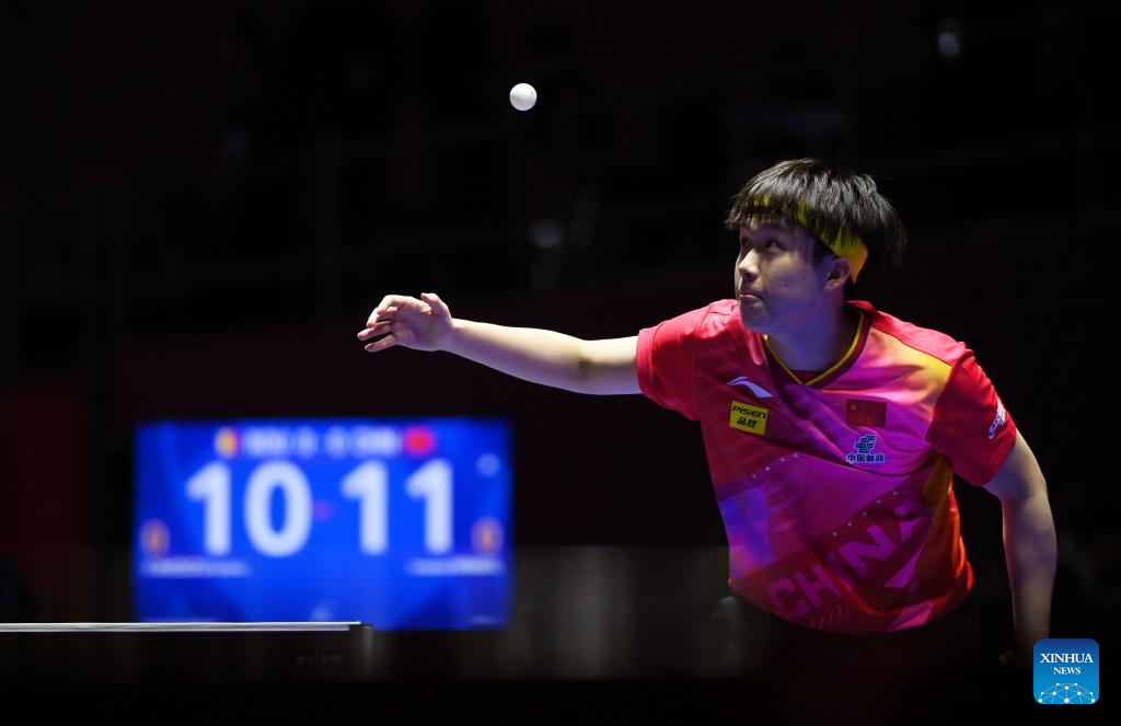 Fan Zhendong of China competes against Eduard Ionescu of Romania during the men's team round of 16 match at the ITTF World Team Table Tennis Championships Finals Busan 2024 in Busan, South Korea, Feb. 21, 2024. (Xinhua/Zhang Tao)