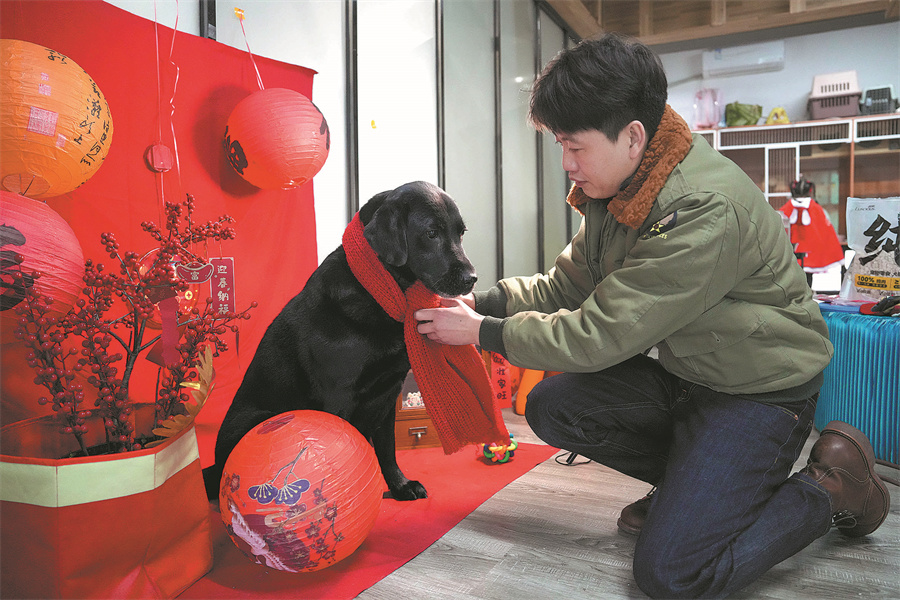 A caretaker at a pet hotel ties a red scarf on a puppy on Feb 9. [YANG HUAFENG/CHINA NEWS SERVICE]