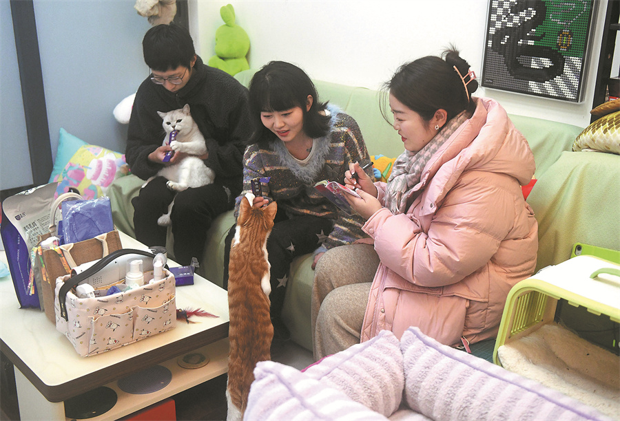 Pet caretaker Gan Shimeng (right) is given cats' information on Feb 3 in Liangjiang New Area in Chongqing. [ZHOU YI/CHINA NEWS SERVICE]