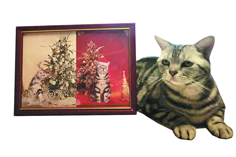A cat sits beside a photo frame at a pet boarding house in Beijing. [Photo/China Daily]