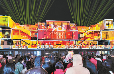 Robots dance to extend Chinese New Year greetings at the Wisdom Bay Science and Technology Innovation Park in Baoshan district, Shanghai, Feb. 12, 2024. (Photo/Chen Yuyu)