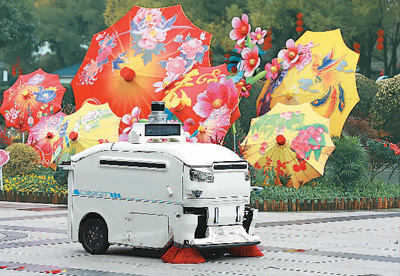 An autonomous robot cleans a street in Yiwu city, east China's Zhejiang Province, Feb. 2, 2024. (Photo/Gong Xianming)