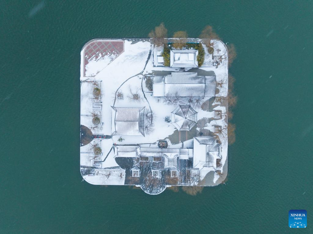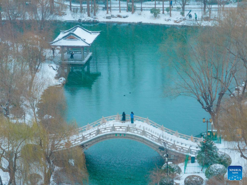 An aerial drone photo taken on Feb. 21, 2024 shows the snow scenery of Daming Lake scenic spot in Jinan, east China's Shandong Province. Various parts of China received snowfalls in recent days. (Photo by Xu Zhou/Xinhua)