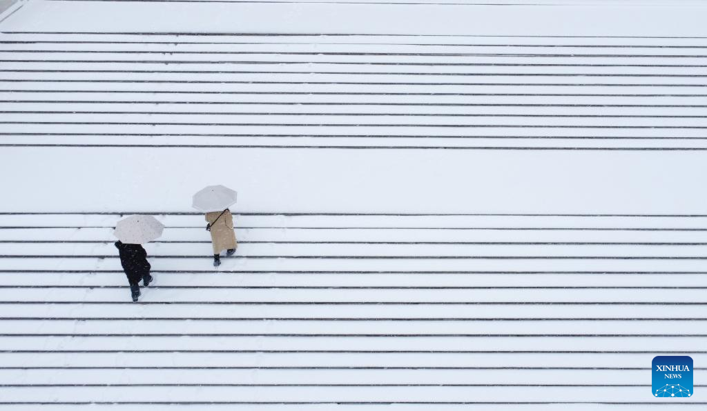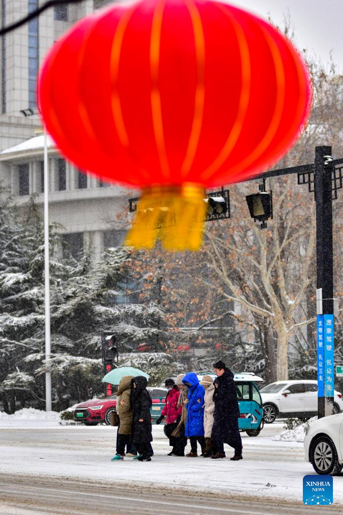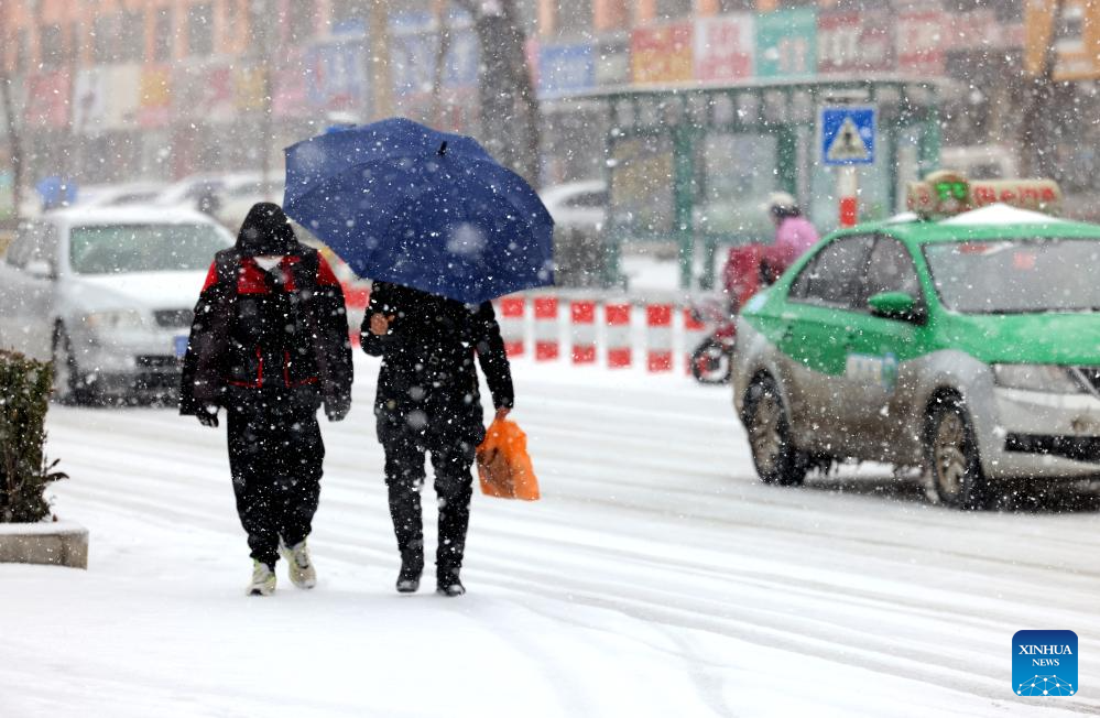People walk on a street in the snow in Zaozhuang, east China's Shandong Province, Feb. 21, 2024. Various parts of China received snowfalls in recent days. (Photo by Sun Zhongzhe/Xinhua)