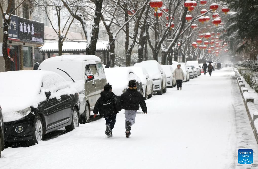 Children run on a street in the snow in Luoyang, central China's Henan Province, Feb. 21, 2024. Various parts of China received snowfalls in recent days. (Photo by Kang Hongjun/Xinhua)
