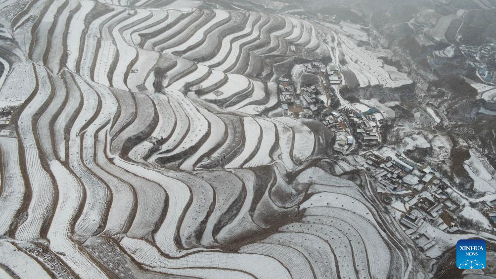 An aerial drone photo taken on Feb. 21, 2024 shows the snow scenery in Anding District of Dingxi, northwest China's Gansu Province. Various parts of China received snowfalls in recent days. (Photo by Wang Kexian/Xinhua)