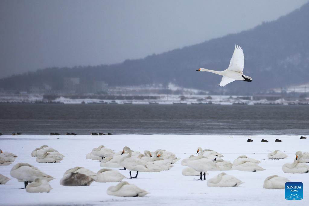 Swans are pictured at a nature reserve after a snowfall in Rongcheng, east China's Shandong Province, Feb. 21, 2024. Various parts of China received snowfalls in recent days. (Photo by Wang Fudong/Xinhua)