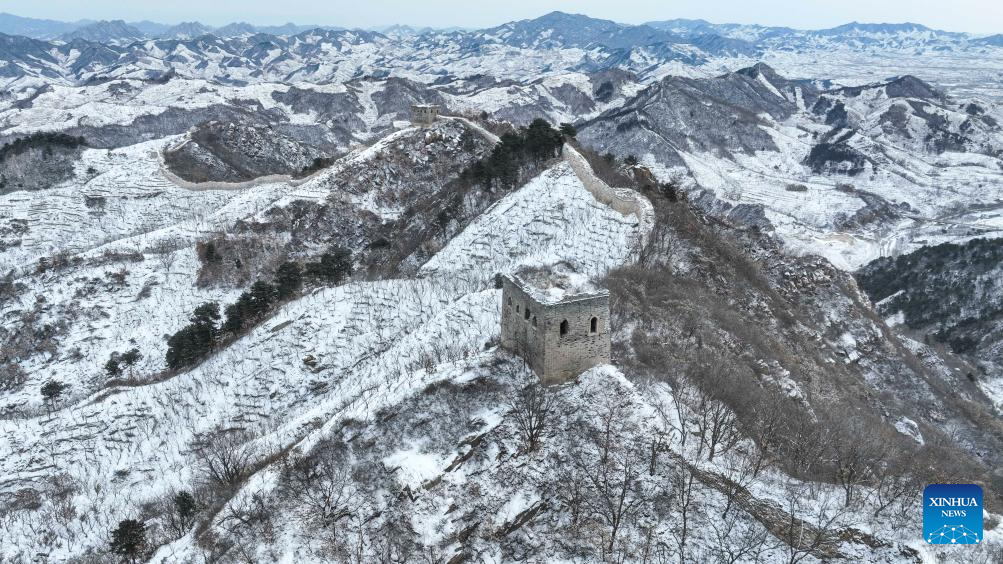 An aerial drone photo taken on Feb. 21, 2024 shows the snow scenery of a section of the Great Wall in Zunhua, north China's Hebei Province. Various parts of China received snowfalls in recent days. (Photo by Liu Mancang/Xinhua)