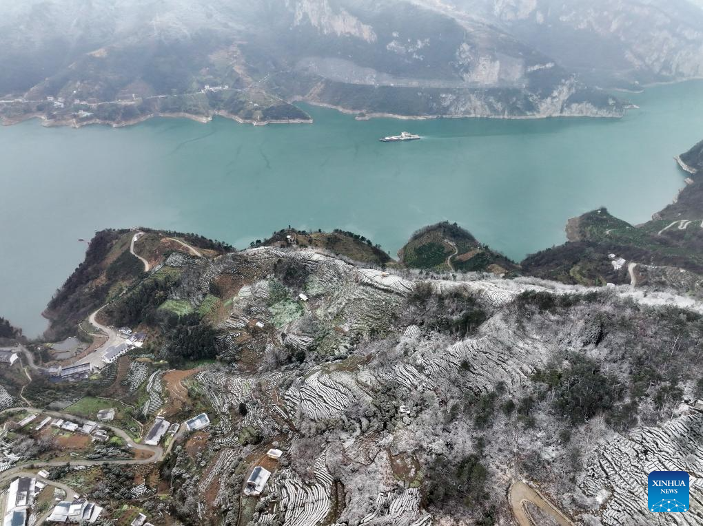 An aerial drone photo taken on Feb. 21, 2024 shows a ship sailing on the Zigui section of the Yangtze River in Yichang, central China's Hubei Province. Various parts of China received snowfalls in recent days. (Photo by Wang Huifu/Xinhua)