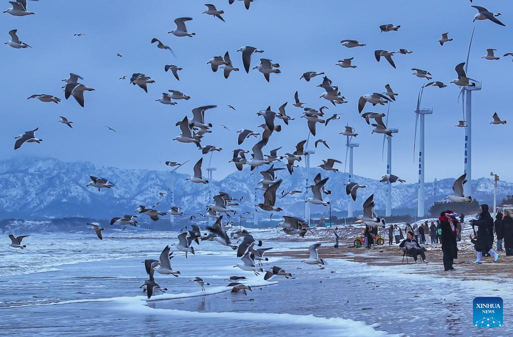 A drone photo taken on Feb. 21, 2024 shows people visiting a scenic spot after a snowfall in Rongcheng, east China's Shandong Province. Various parts of China received snowfalls in recent days. (Photo by Li Xinjun/Xinhua)