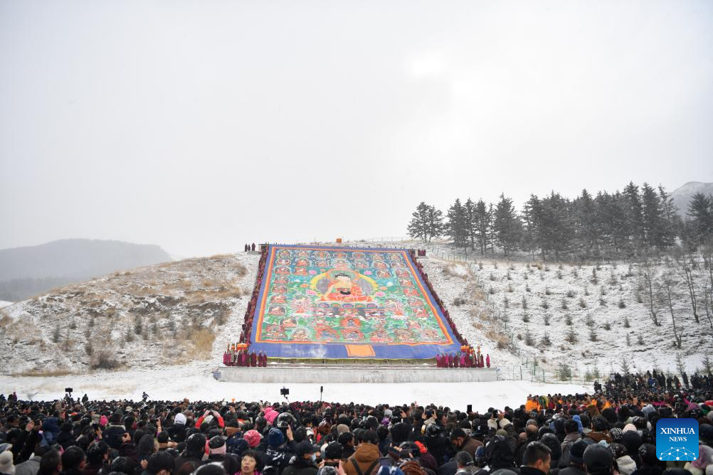 LANZHOU, Feb. 22 (Xinhua) -- More than 40,000 believers and visitors from home and abroad attended a grand Tibetan Buddhist event, known as the "sunning of the Buddha" ceremony, held Thursday at Labrang Monastery in northwest China's Gansu Province.