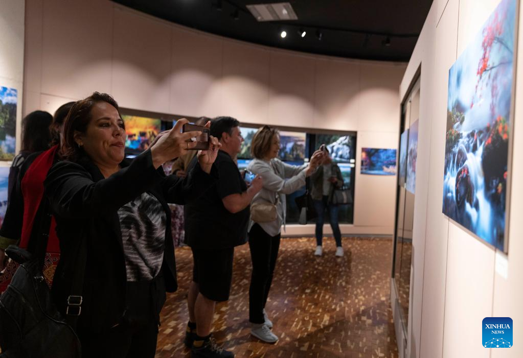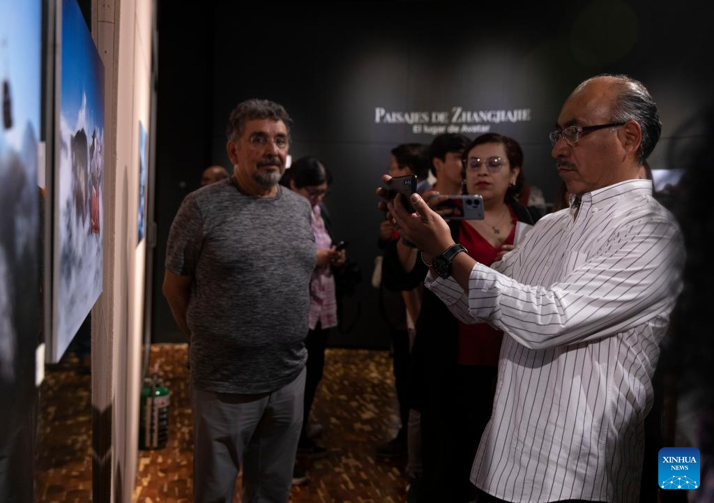 Visitors take photos during a photo exhibition of China's Zhangjiajie in Mexico City, Mexico, Feb. 20, 2024. (Xinhua/Li Mengxin)