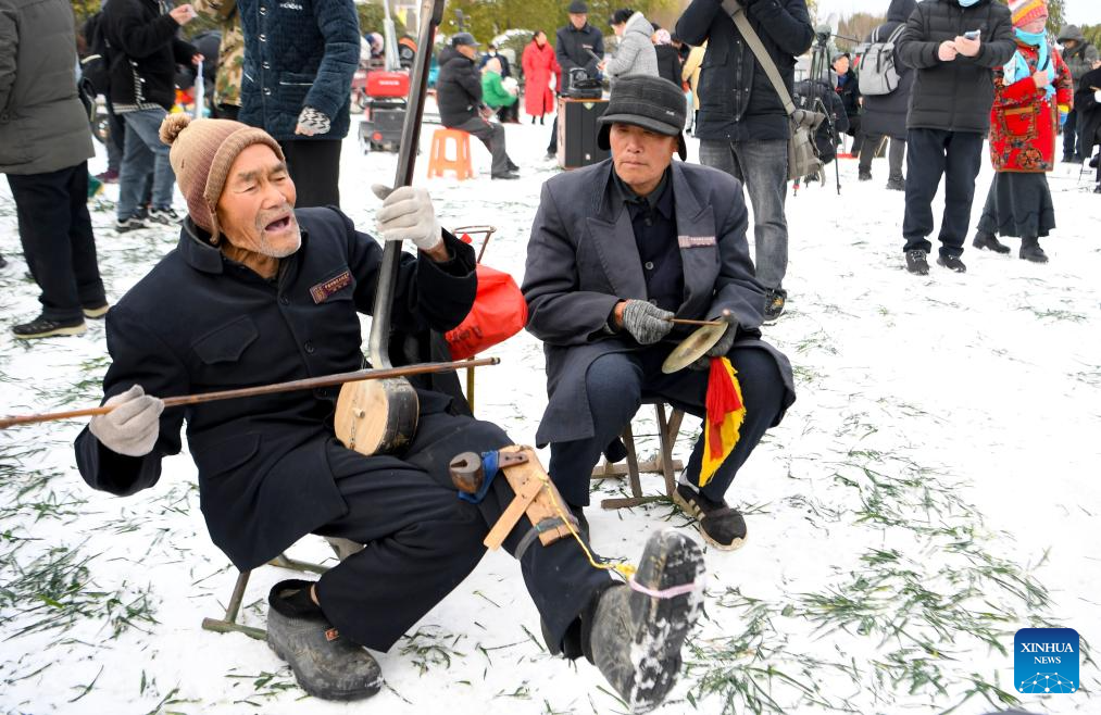 A folk artist performs during the Quyi fair in Majie Village of Baofeng County, central China's Henan Province, Feb. 22, 2024. (Xinhua/Hao Yuan)